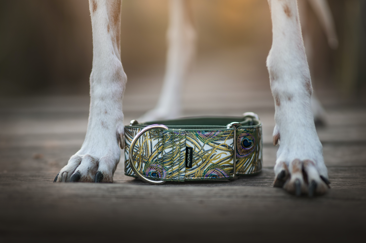 Obojek martingale pro chrta, paví peří, zlatá má jádro tvořené z pevného polypropylenového popruhu. Svrchní strana obojku je ušitá z dekorační látky velmi vysoké gramáže . Podšívka obojku je softshellová.