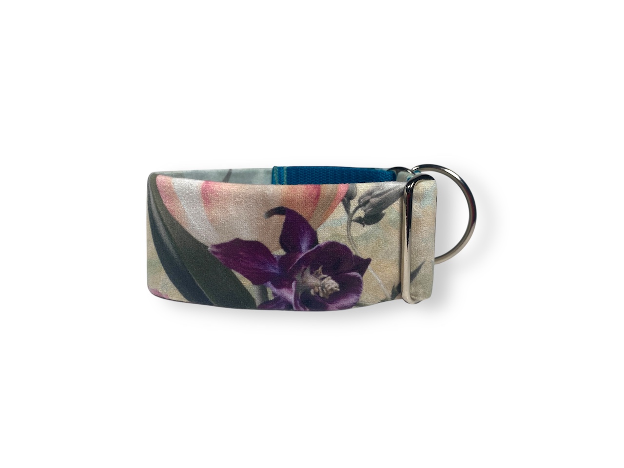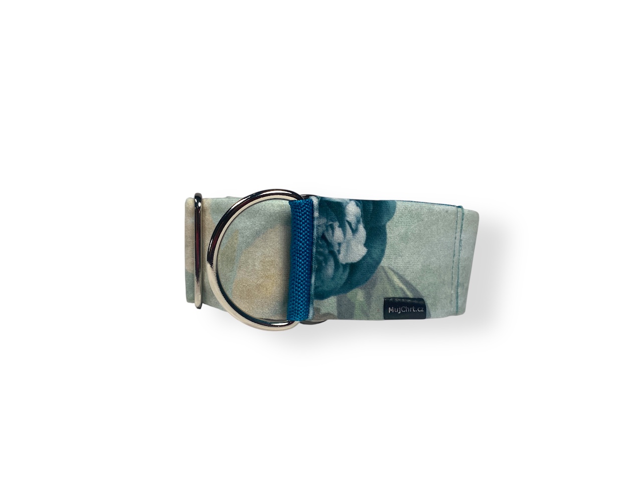 Obojek pro chrta polostahovací, Květy petrolejová, velur je pohodlný obojek v luxusním vzhledu, který je vhodný pro běžné nošení i slavnostní chvíle.